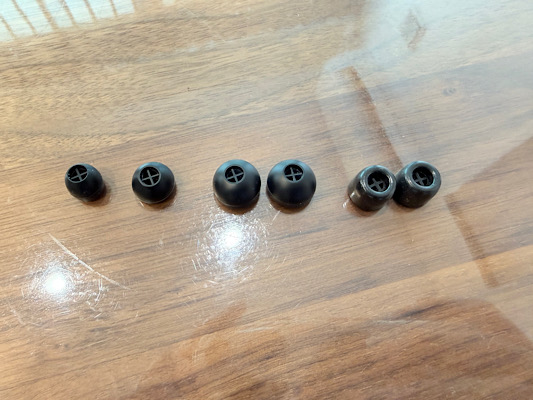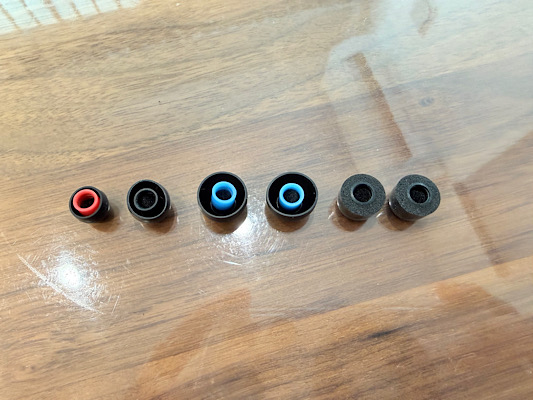 一般的な柔らかいシリコンのイヤーチップがS/M/Lの3種類と、表面はツルツル加工だけどスポンジのような素材のイヤーチップも同梱されています。