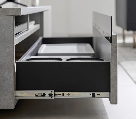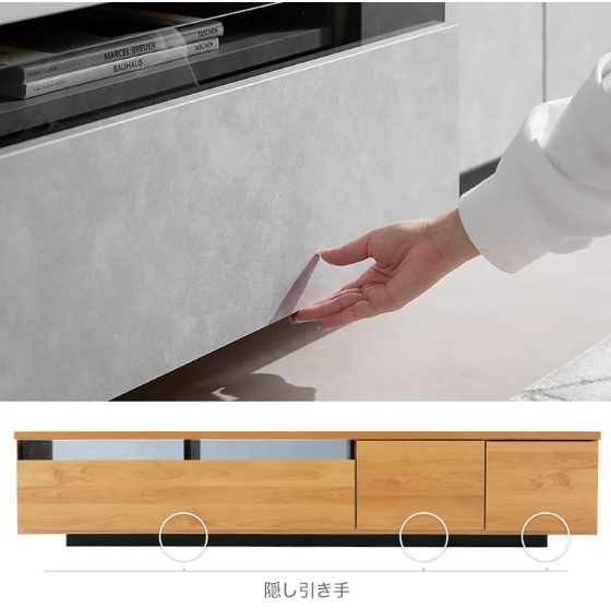 リモコンの赤外線を通すガラス窓に、容量たっぷりの引き出し収納。